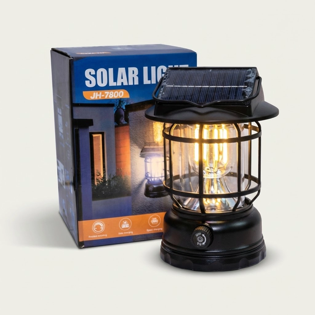 The JH-7800 Solar Light is a stylish, vintage-inspired lantern designed for both function and ambiance. Powered by solar energy, it’s perfect for outdoor patios, gardens, camping, or emergency lighting. With stepless dimming and USB Type-C charging support, it offers flexibility and modern convenience.